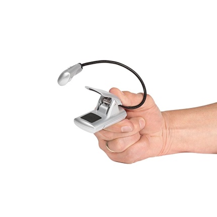 Lyset spredes godt med den ca. 20 cm fleksible arm God i sengen, toget eller flyet 30 mm clips holder godt fast i bogen