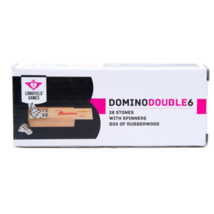Domino Double 6 med 29 sten i trææske. Stenene har sorte øjne og måler 41 x 20 x 7 mm