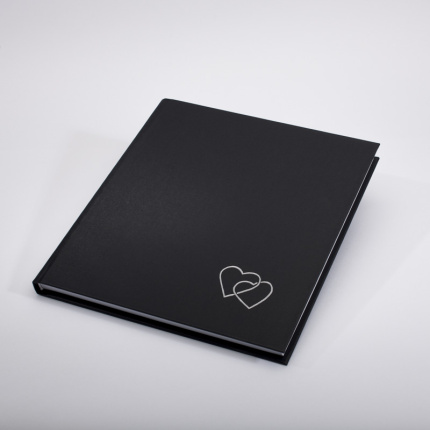 GÆSTEBOG SORT SØLVHJERTER – 23×25 LÆRRED