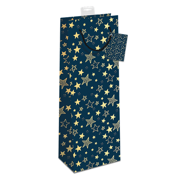 GAVEPOSE TIL FLASKE " BLÅ MED STJERNER" GULD FOLIE - UDGÅR