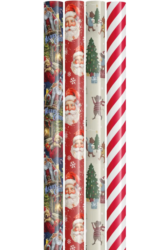 Forside Nyheder INDPAKNING & EMBALLAGE Gavepapir, bånd & tilbehør JULEPAPIR 0,7 X 10 M 25 RULLER 4 ASS.