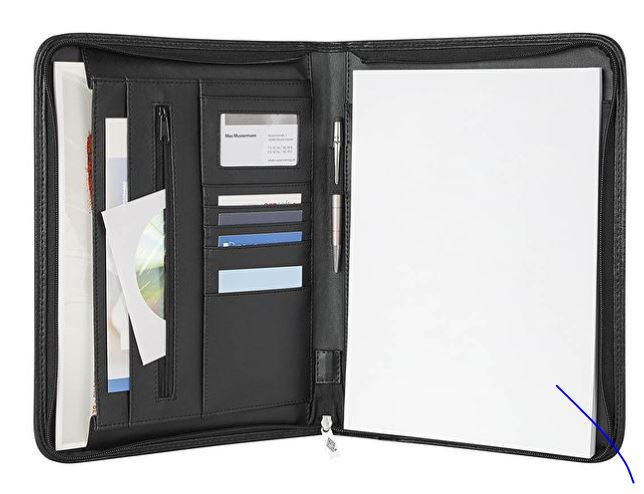 Indeholder bl.a. notesblok, elastik til kuglepen, plastikvindue til visitkort, fire kortholdere, m.m