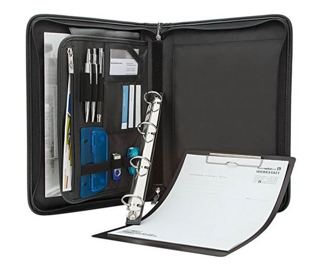 Indeholder udtagelig clipboard, 4 ringe, lommer til visitkort og lomme til papirer og penneholder.