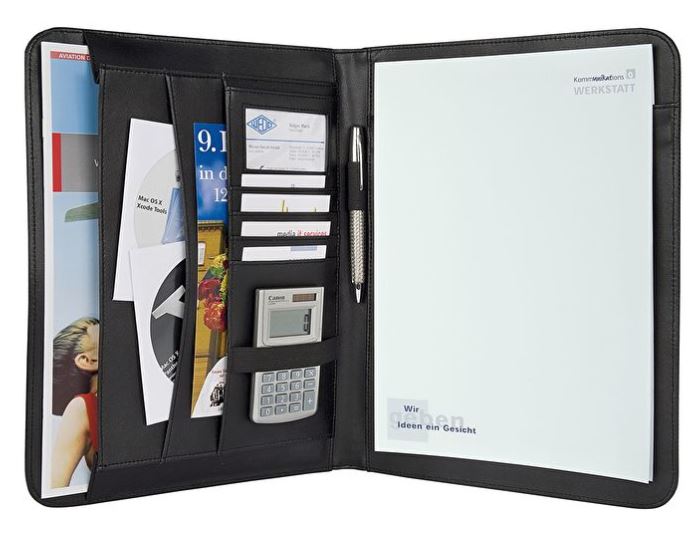 med plads til A4 notesblok, penneholder, fire kortlommer,