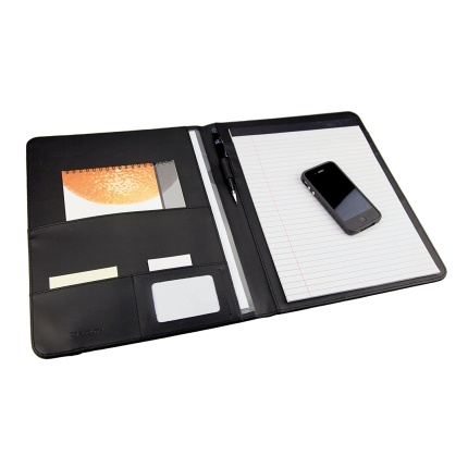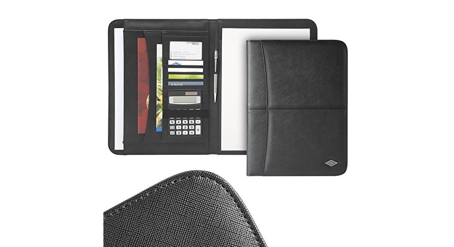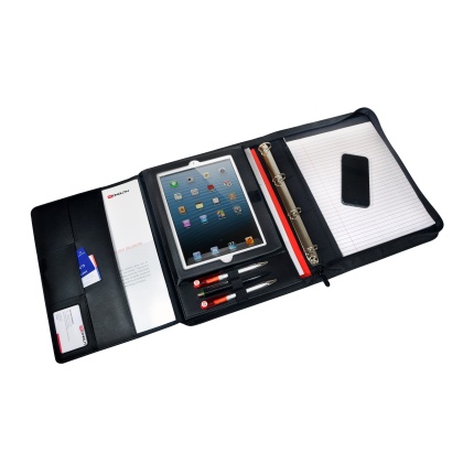 Konferencemappe m. lynlåslukning. Indeholder udtagelig clipboard, 4 ringe, lommer til visitkort og lomme til papirer og penneholder. Udvendig er der lomme på mappen.