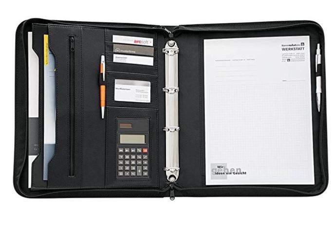 Med aftagelige ringe, A4 blok og lommeregner. Har lynlås