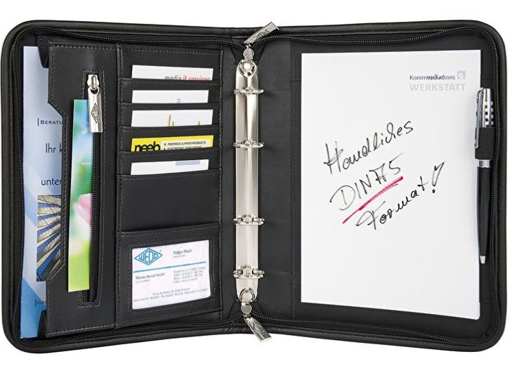 Mappen har 4 ringe, plads til visitkort, indvendig lomme m. lynlås, ekstra lomme til papirer og blok