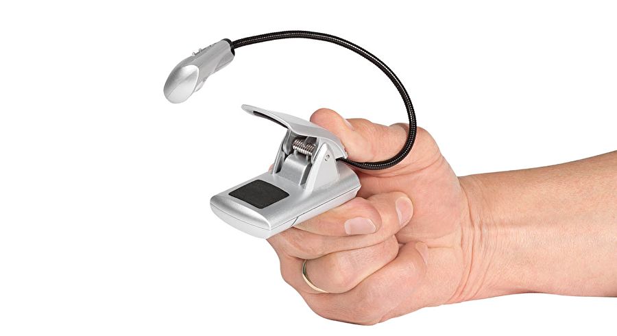 Lyset spredes godt med den ca. 20 cm fleksible arm God i sengen, toget eller flyet 30 mm clips der holder godt fast på bogen